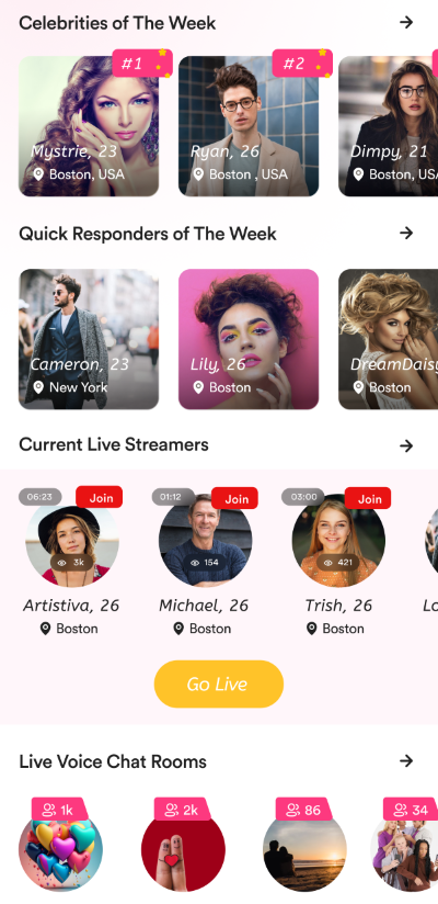Allowing users to go live and engage in real-time video interactions with potential matches.